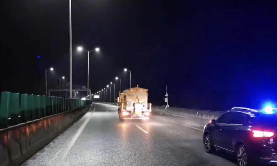 2月15日晚,工作人员在二广高速九嶷山至丰阳双向易结冰路段撒布融雪剂。通讯员 陆桥轩供图