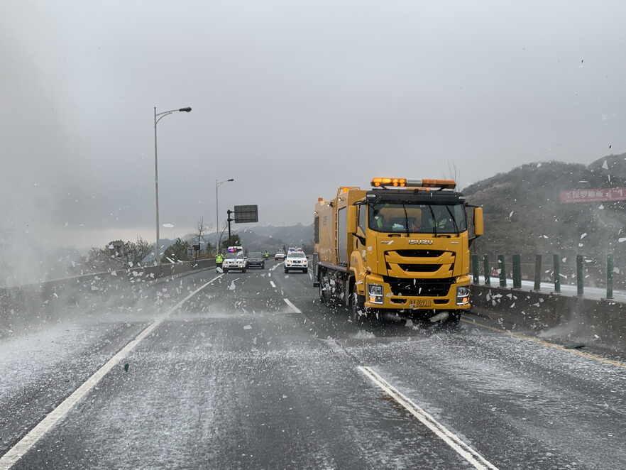 2月16日,广东省交通集团启用狂风吹雪车,在京港澳高速京珠北段雾观大桥上吹除冰雪。通讯员 沈高供图。