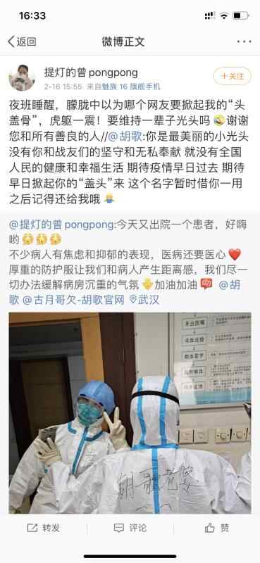 “今天又出院一个患者,好嗨呦!”2月8日,身在武汉的护士“提灯的曾pongpong”发了这样一条积极的微博。配图中她和同事比着胜利的手势,而她身穿的防护服背后的四个大字亮了——胡歌老婆!
