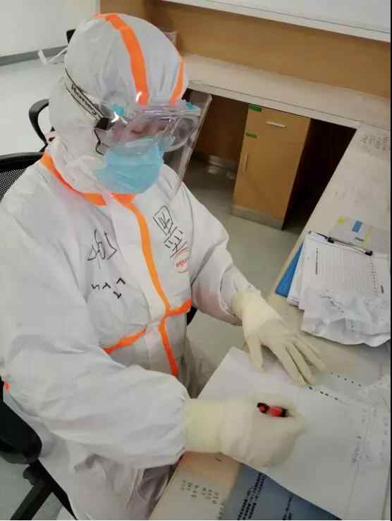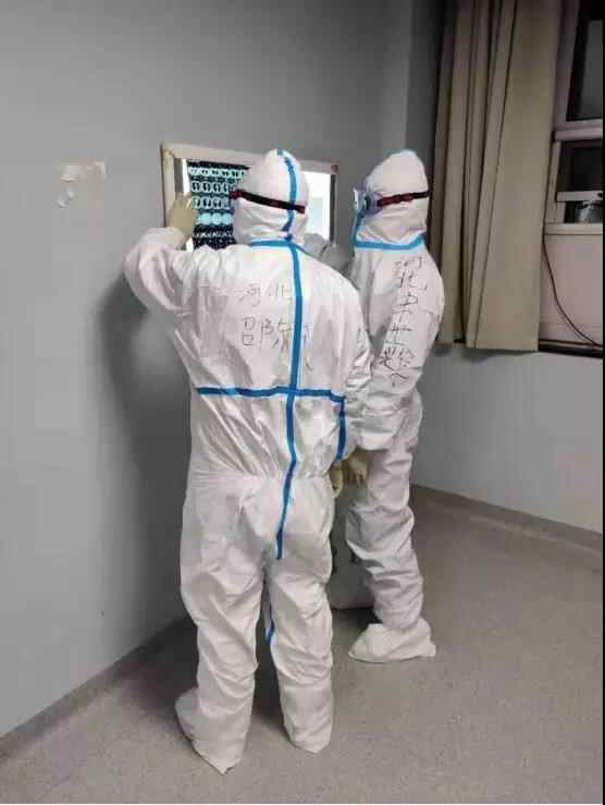 我也经常会在病房里被一些小小的瞬间感动到。我觉得有时候病人真的是挺可爱的,我就记得那时候那个96年的那个年轻小伙子就看着我们的隔离服,他说我每天都看你们全部的人穿成这个样子,我都分不出来你们谁是谁啊,然后他就拿那个记号笔在我们衣服后面写“平安喜乐”。他还给我们拍照,然后隔着那个隔离病房从窗户里透过来给我们点赞,你知道吗?真的让你觉得很温暖。