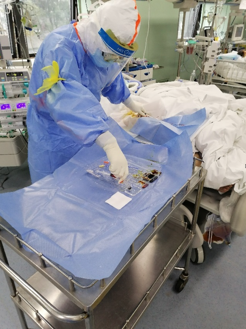 另外,由于进入ICU病房本身就要带上两副手套,做深静脉穿刺还要额外再带一副无菌手套,总共是3层手套。在这“全副武装”下,我们的操作过程难度变得非常的大,但是还是靠着平时打下的基础,最终给这例患者置管成功,心中也松了一口气,也算打赢了一个小小的阻击战。