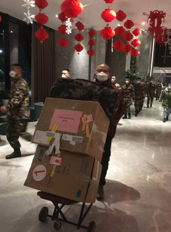 11日凌晨2点,我随第二批广东省支援荆州医疗队经过长途跋涉,终于到达荆州市珀骊酒店。在荆州特警队的帮助协调下,顺利整理好了各自的行李和物资。荆州市卫健委和政府为我们准备的酒店24小时供应大家的餐食,以保证我们无论什么时候都能吃上热乎的饭菜,喝上一碗热热的湖北莲藕汤,我们感觉心里很温暖。