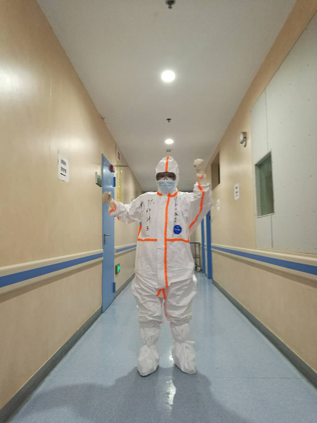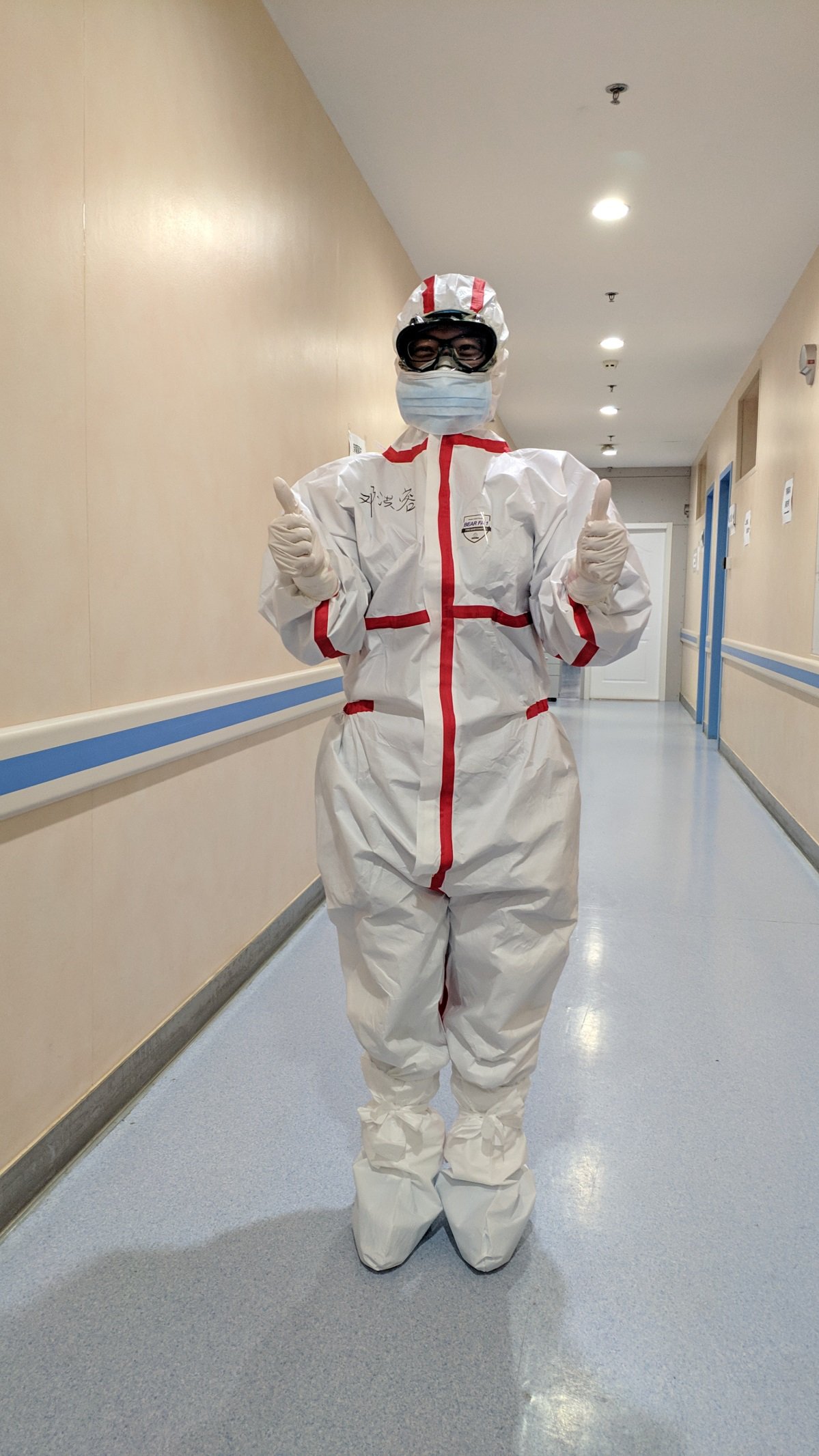 2月10日,到达武汉次日,晚上要开始收病人,师妹和其他教官一样,在同济医院结合实地条件一遍一遍地教如何穿脱防护服。紧张的带教完毕,第一批二十余人穿上防护服准备进入隔离病房,她逐个帮忙检查有无防护漏洞。