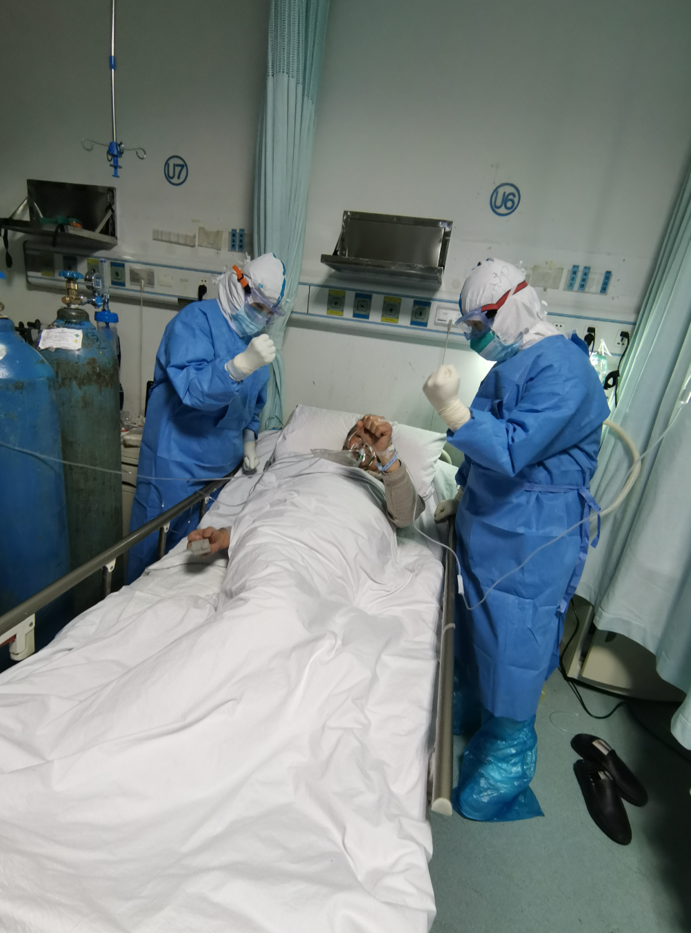 20点的时候,我照常穿好防护服来到病房,首先去看了一下U6的老爷子,发现他已经没有用无创呼吸机辅助呼吸了,只是面罩给氧,血氧饱和度居然有98%,我自己都有点激动了,老爷子今天心情也不错,估计在床上躺太久了,一直想下床活动。