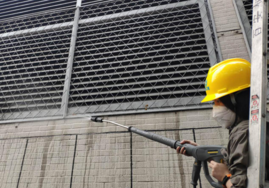 风亭作为外界空气进入地铁重要的过渡空间,容易积尘,需要重点清洗防护,用水冲洗清洁效果最佳,但长寿路站B口风亭离车站出入口约30米,无法从站内拉电用水。为此,黄靖恩带领团队从高处的冷却塔配电箱上拉电,通过接电再拉线盘,保障了机器用电;由于风亭周边没有取水地点,黄靖恩主动与站外停车场负责人沟通协调,确保了用水来源。