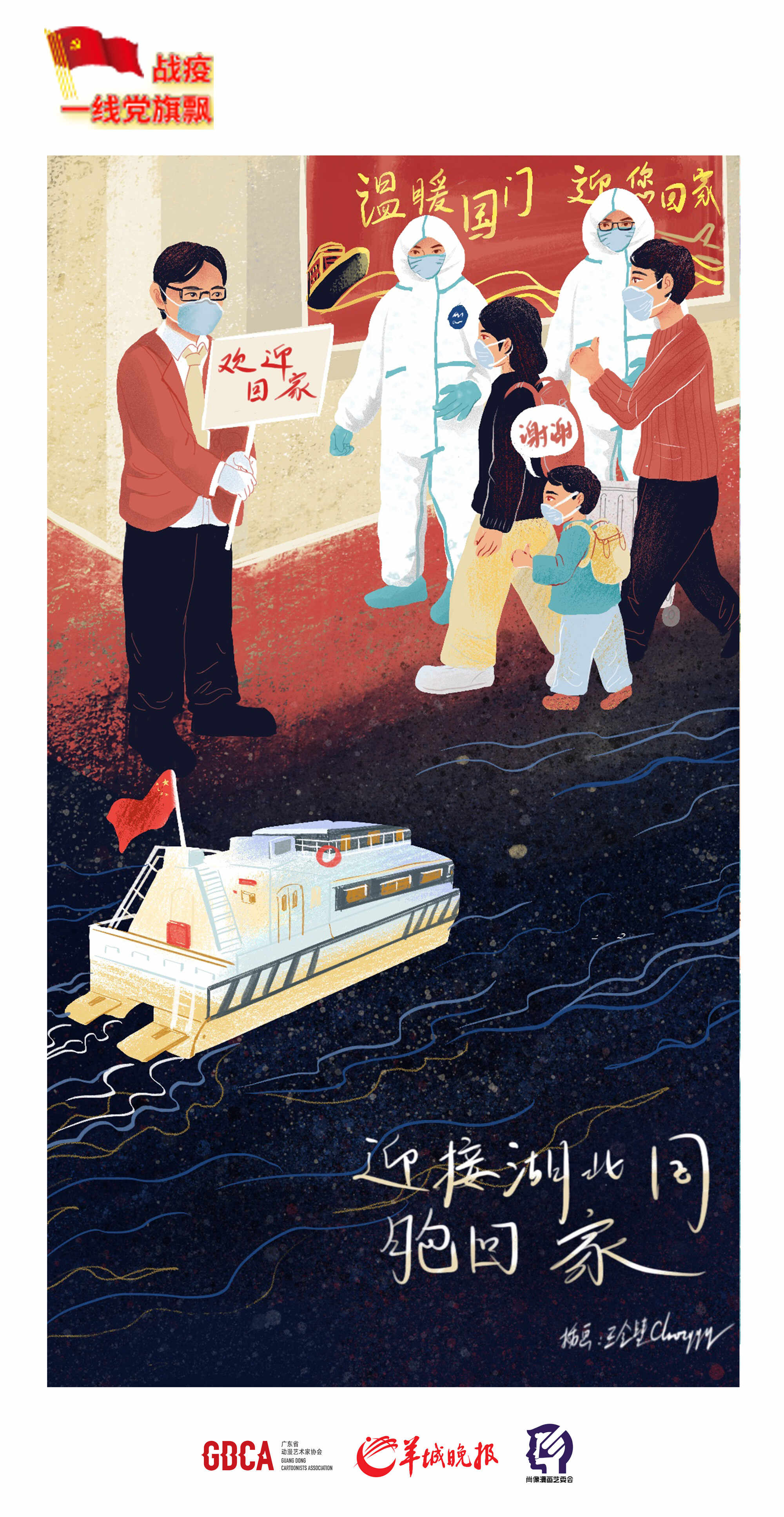 2月21日,“战疫一线党旗飘”系列漫画刊发第十一期,推出动漫艺术家王会慧创作的两幅作品《欢迎回家》《白衣战士》。“战疫一线党旗飘”系列漫画由广东省动漫艺术家协会、广州市动漫艺术家协会党支部与羊城晚报联手策划推出,谱写抗击新型冠状病毒感染的肺炎疫情的动人画卷。