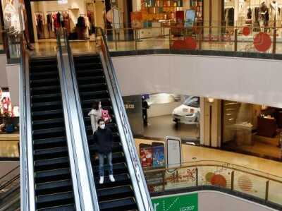 孩子戴着口罩在吴江路休闲街上游玩。 殷立勤 摄