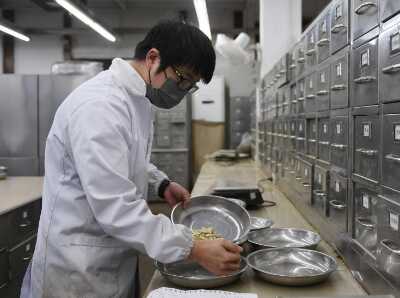 2月22日,方回春堂工作人员正在封装药包。近日,浙江省发布普通人群使用中药预防疫病推荐方,助力复工复产,增强普通人群抗疫病能力,该处方为生黄芪9克、生白术9克、防风6克、金银花9克、广藿香9克、生甘草6克。中新社记者 王刚 摄