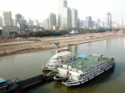 两艘船共有218间客房,客房配备了卫生间、淋浴、空调等设施,将作为医护酒店使用。图为抵达武汉的长江游船。