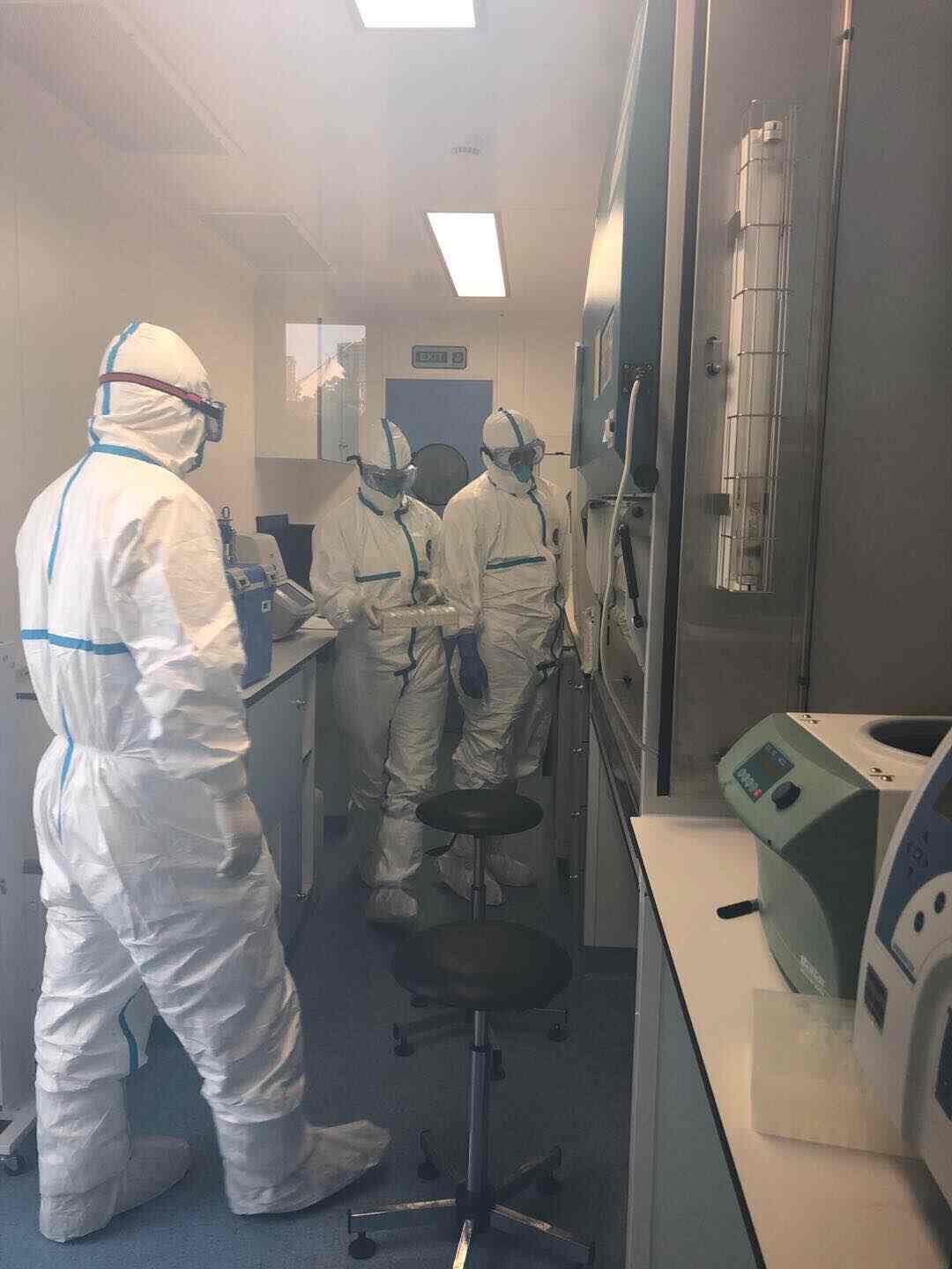 陈经雕和同事在移动P3实验室内进行核酸检测