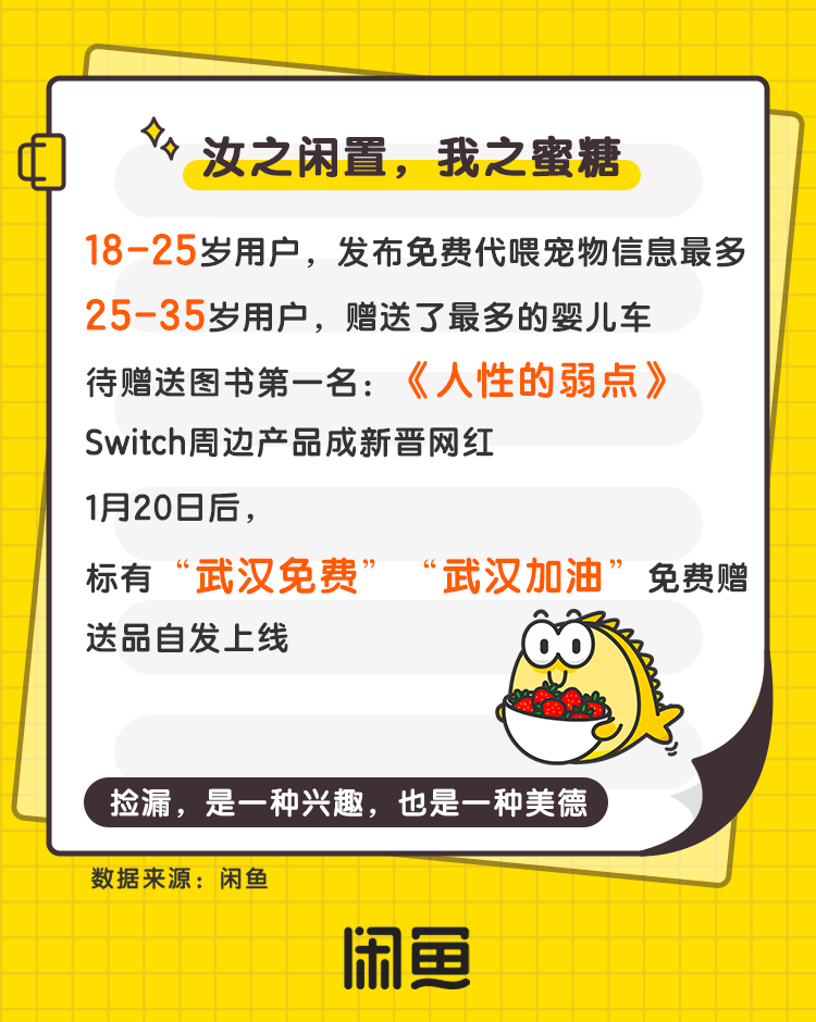 对于闲置交易平台而言,“免费送”是众多玩法中的一种,但捡漏是不变的用户心智。随着中国逐渐从增量经济向存量经济转变、人口的加速流动,越来越大的闲置资源让捡漏成为可能。而作为国内最大、日活跃用户(DAU)约2000万的闲置交易平台,闲鱼希望借“22闲鱼日”向用户传递这样的理念:闲鱼是愉快分享而不是刻意创造闲置的平台,在闲鱼可以淘到真正价廉物美的物品。