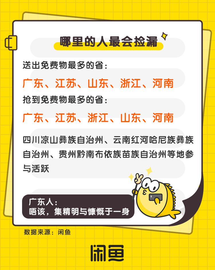 这份报告也给出了一些亮点数据。比如,送出物品最多与捡漏最多的省份都是广东,广东人成了既精明又慷慨的代表,江苏、山东、浙江、河南等省份则紧随其后,四川凉山彝族自治州、云南红河哈尼族彝族自治州、贵州黔南布依族苗族自治州等地,参与活跃度也很高。从不同年龄层看,18-25岁用户,发布免费代喂宠物信息最多;25-35岁用户,赠送了最多的婴儿车。从性别上看,男性更爱赠送,女性更爱捡漏,女性在捡漏上的“性别顺差”。