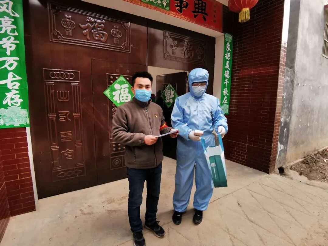 张凯歌(左)与村医一起到武汉返乡人员家中检测体温