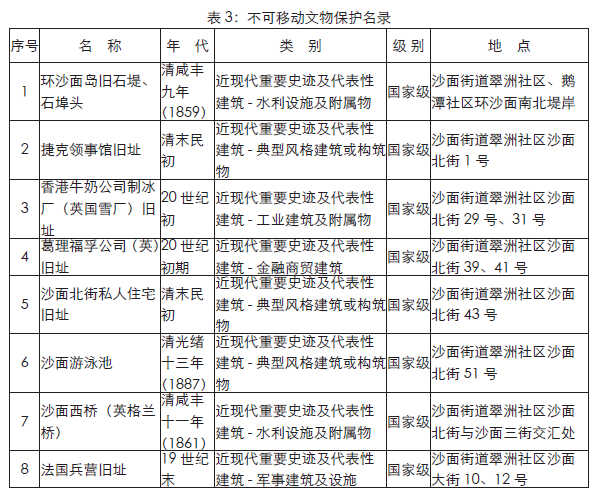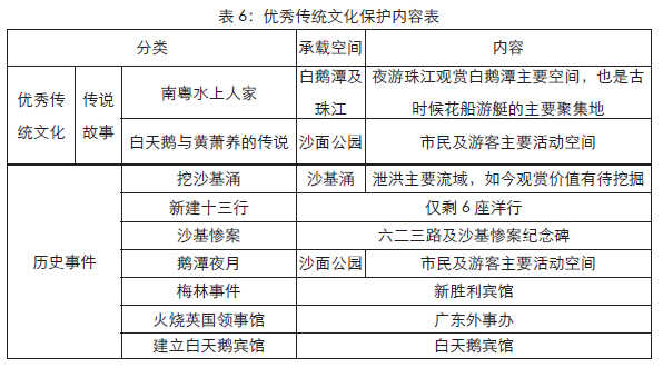 沙面承载中国近现代开放改革创新的历史价值,文化遗存众多。有国家级文保单位——沙面建筑群,包含49栋文物建筑,及一座桥,两个公园,1处石堤、石埠头,以及1个网球场。从白天鹅与黄萧养的传说故事,到白天鹅宾馆建成的历史事件,都被列入优秀传统文化加以保护。