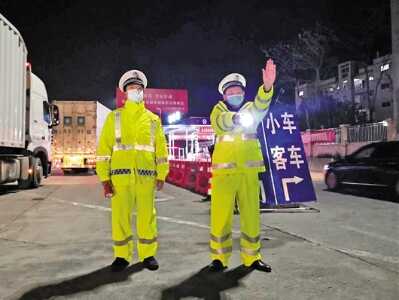 我们从凌晨1点开始上岗,负责在检查站外的不同点位引导车辆进站检查、维护现场交通秩序。因为要分清来车属于货车还是私家车,以便引导车辆进入不同车道接受检疫检查。要远远判断来车车型,双眼就要一直望着汽车大灯,时间久了眼睛疲劳,就会觉得眼花缭乱。