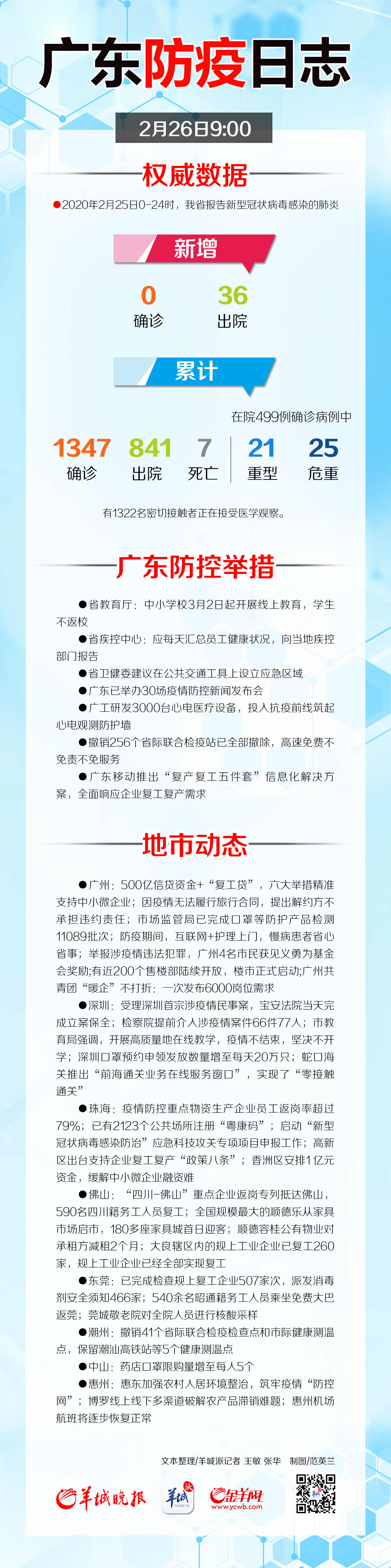 ●广州:500亿信贷资金+“复工贷”,六大举措精准支持中小微企业;因疫情无法履行旅行合同,提出解约方不承担违约责任;市场监管局已完成口罩等防护产品检测11089批次;防疫期间,互联网+护理上门,慢病患者省心省事;举报涉疫情违法犯罪,广州4名市民获见义勇为基金会奖励;有近200个售楼部陆续开放,楼市正式启动了;广州共青团“暖企”不打折:一次发布6000岗位需求。