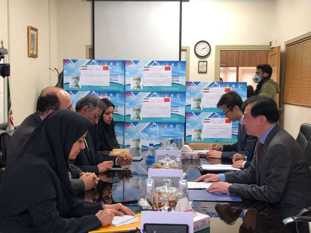 (驻伊朗大使常华代表中国使馆和在伊有关中资企业紧急向伊卫生部捐赠25万只口罩,助力伊朗抗击新冠肺炎疫情。图片来自中国驻伊朗大使馆)