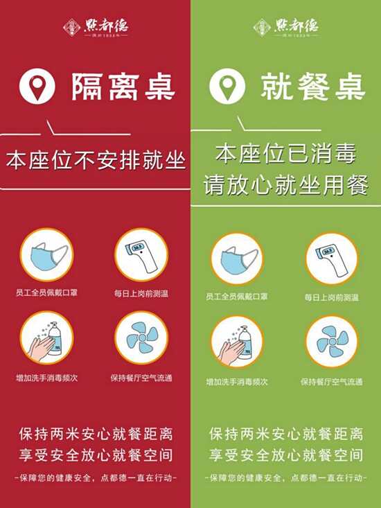 我们已经制作好了隔离桌与就餐桌的餐台指示牌,在佩戴口罩、测体温、洗手消毒、餐厅空气流通等多方面做好准备,届时让食客保持2米安心就餐距离,享受安全放心的就餐空间。