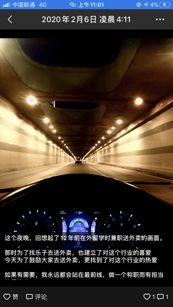 活泼烧烤合伙人的一条朋友圈记录了凌晨4点送外卖的心境。朋友圈截图