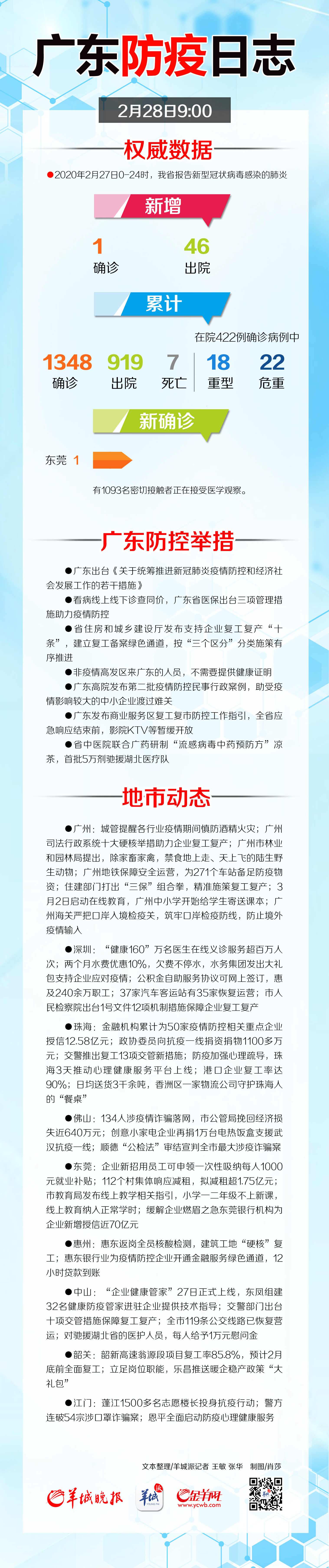 截至2月27日24时,全省累计报告新冠肺炎确诊病例1348例,累计出院919例,累计死亡7例。27日当天全省新增确诊病例1例,为东莞市1例。新增出院46例,5例为重型病例治愈出院,41例为普通型或轻型病例治愈出院。有疑似病例2例。有1093名密切接触者正在接受医学观察。