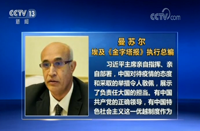 埃及《金字塔报》执行总编曼苏尔表示,习近平主席亲自指挥、亲自部署,中国对待疫情的态度和采取的举措令人敬佩,展示了负责任大国的担当。有中国共产党的正确领导,有中国特色社会主义这一优越制度作为保障,中国一定能战胜疫情,赢得这场疫情防控阻击战的胜利。