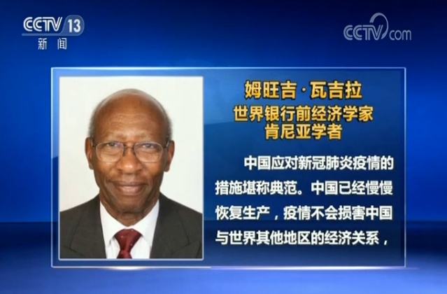 世界银行前经济学家、肯尼亚学者姆旺吉·瓦吉拉表示,中国应对新冠肺炎疫情的措施堪称典范。中国已经慢慢恢复生产,疫情不会损害中国与世界其他地区的经济关系,不会影响到中国作为世界第二大经济体的地位。