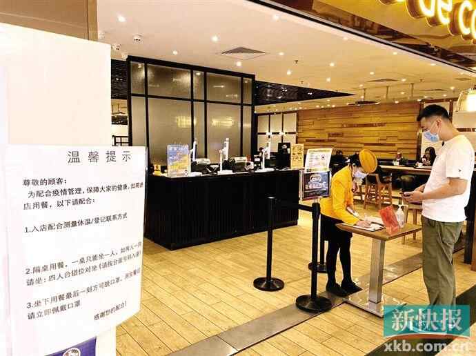 而在越秀区一家拉面店内,4名顾客正在就餐,且严格地隔开座位就餐。店内工作人员说:“我们会提醒顾客隔开座位就座,对进店顾客测量体温,如果人流超过一定量,也会采取限流措施。”在胖哥俩肉蟹煲则对出入口分开设置,疏导人流。