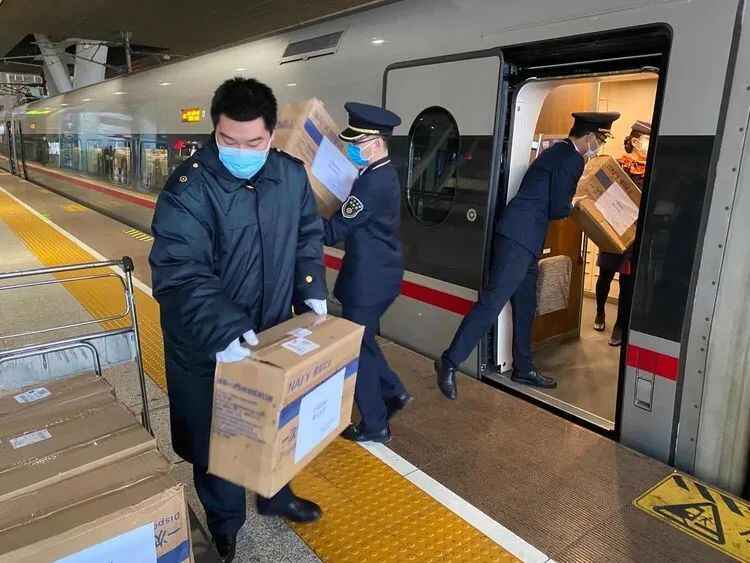 13时16分,列车到达虎门站,20箱由铁路青少年发展捐助中心捐赠的支援物资已经等候在站台上。停靠时间只有7分钟,林旭便带领乘务员全员参与搬运,只用四分钟就结束“战斗”。