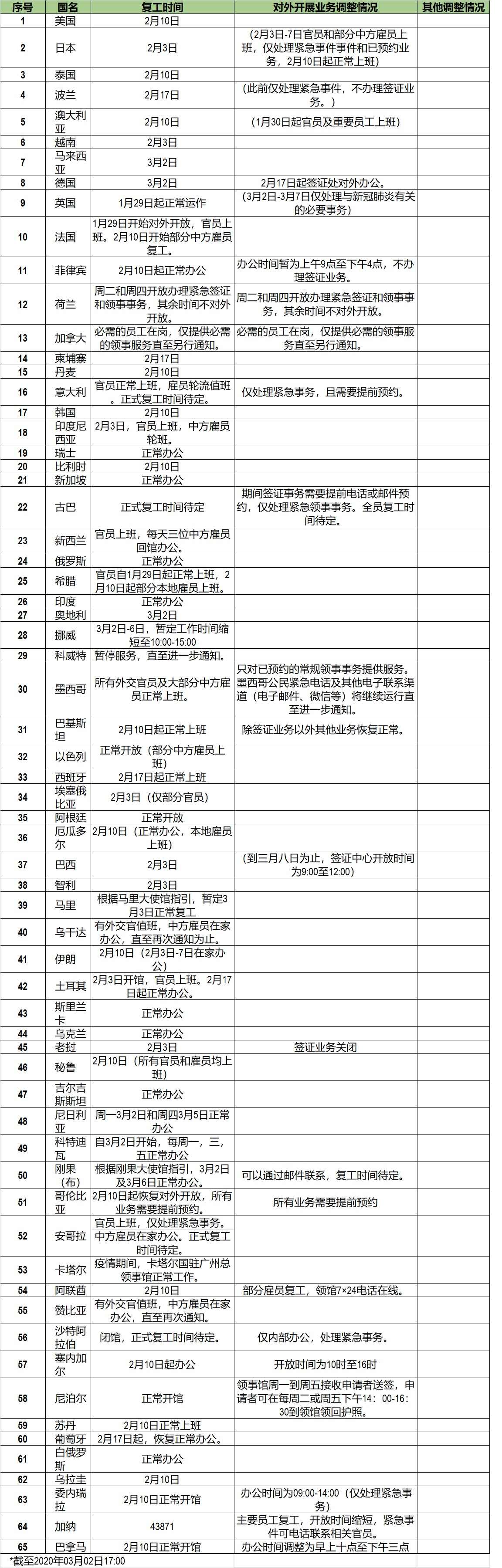记者3月2日从广东省人民政府外事办公室官方网站获悉,截至3月2日17时,多个外国驻穗领馆已复工,但并非所有业务恢复,有的仅处理紧急业务,不办理签证业务,有的则缩短了工作时间。具体复工情况,详见下表: