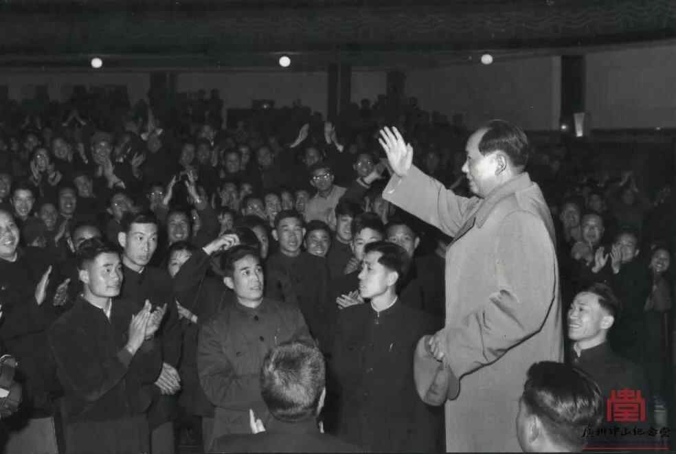 ▲新中国成立后,毛泽东主席曾在中山纪念堂接见干部、战士,他从东门进去,楼上楼下、舞台前后、走廊内外,都认真端详,频频称许说:“这是中国人自己设计建造的伟大建筑物,讲中国不行,为什么能搞这么大的建筑?”图为1958年1月24日,毛泽东主席在中山纪念堂和群众一起。