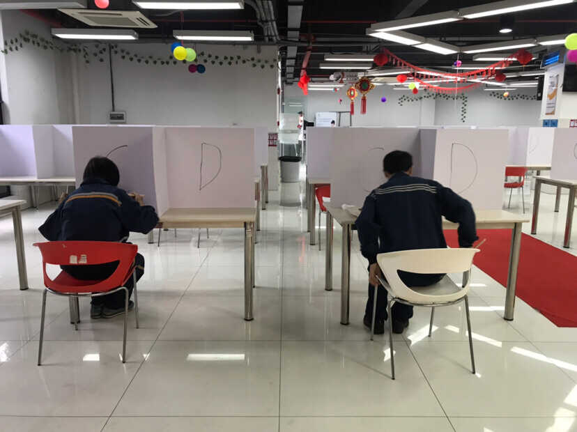 中午用餐时,公司用纸板将餐桌空间一分为四,让员工与员工之间隔开用餐,办公环境和办公用具则经过消毒处理。