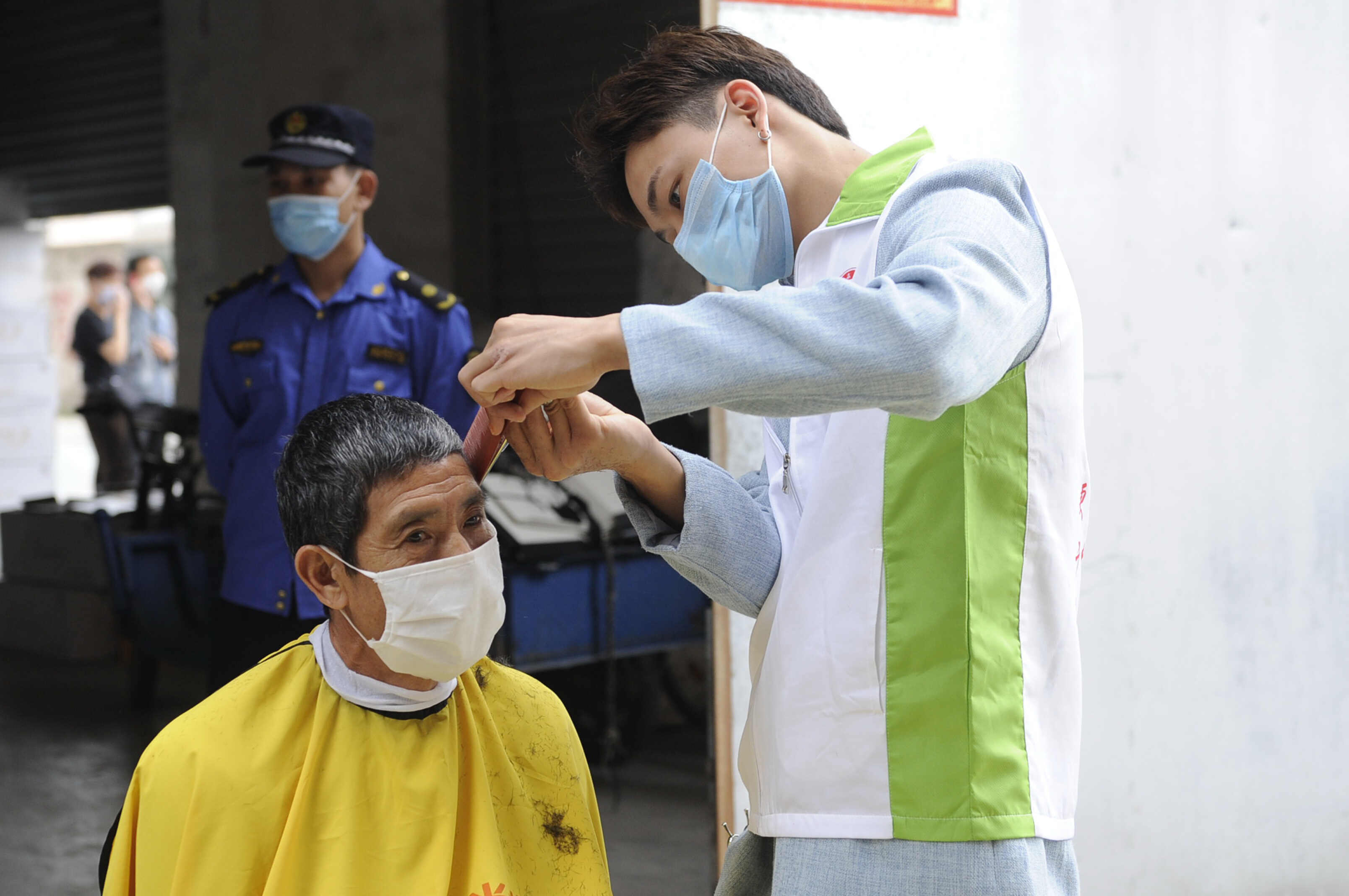 志愿者陈中寿是个97年的小伙子,但已经有6年的理发经验,“今天预计给6个职工理发,我会和他们沟通想要的发型,尽量满足他们的需求。”陈中寿告诉记者,这次是他第二次疫情期间提供义剪服务,第一次给30个职工理发,“理发还是比较轻松的,就是我们的本职工作,比我们辛苦的人更多,我愿意为他们服务。”