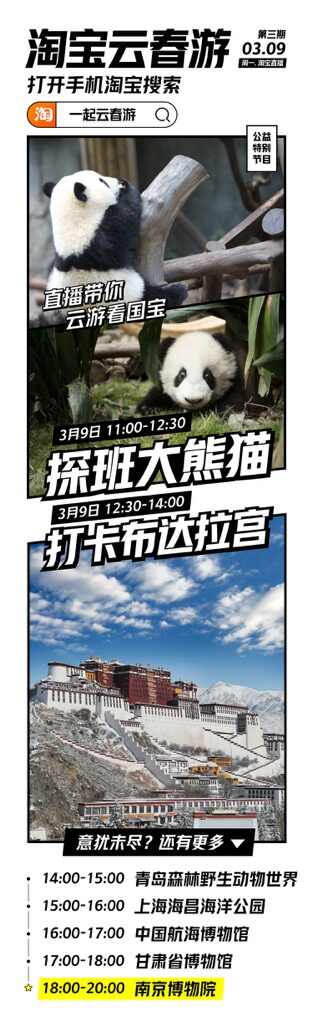 3月9日中午11点,第三期淘宝直播“云春游”又双叒来了!此次将迎来大熊猫亮相、布达拉宫首开5G直播返场,青岛森林野生动物世界创新“云领养”、上海的海昌海洋世界让企鹅与鲨鱼“连麦”……“云春游”变得更好玩了!各位游客在淘宝APP里搜索“一起云春游”即可加入参观。
