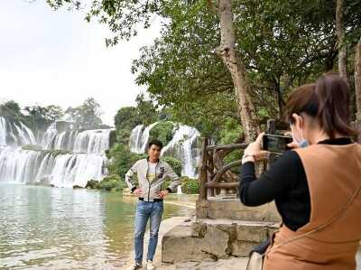 3月10日,广西崇左市大新县境内的德天瀑布景区,一游客在瀑布前拍照留念。近日,德天瀑布景区恢复营业,陆续吸引游客前往观赏。德天瀑布与越南板约瀑布相连,是亚洲第一、世界第四大跨国瀑布。中新社记者 俞靖 摄