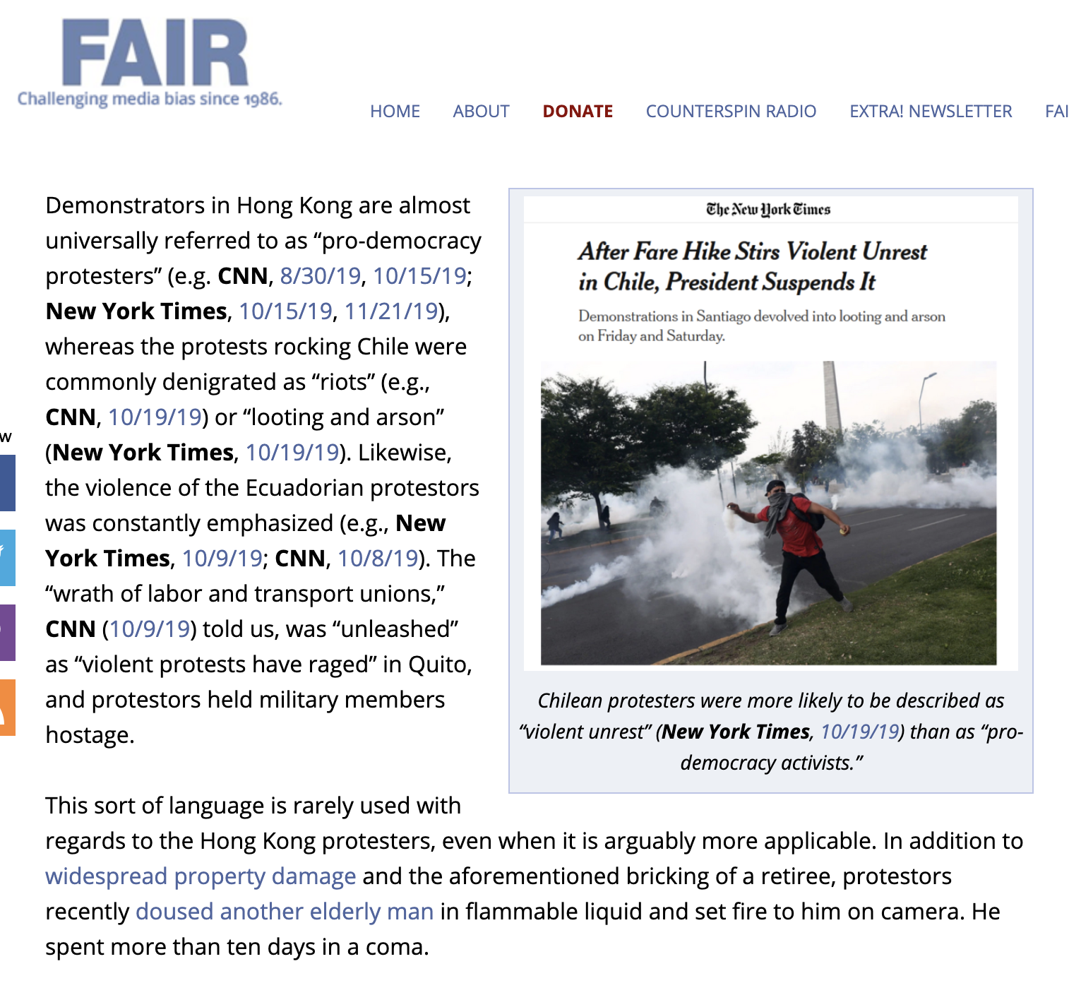 △这是美国非政府组织网站 fair.org对于《纽约时报》歪曲事实、双重标准报道的对比分析