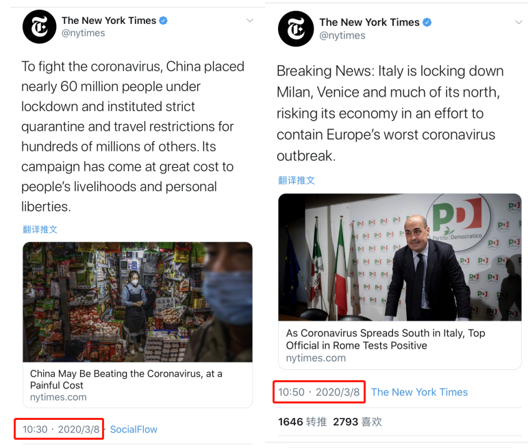3月8日,《纽约时报》在其官方社交媒体上先后发布了两条推文。