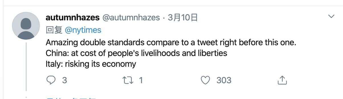 △网友 autumnhazes:跟前一条推文相比双标太明显了吧。中国:以人民的生活和自由为代价;意大利:冒着伤害经济的风险