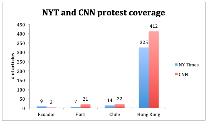 △《纽约时报》和CNN同期就香港刊发737篇报道,其他报道只有36篇涉智利、28篇涉海地、12篇涉厄瓜多尔。其报道的绝对数量暗示了其扭曲程度。