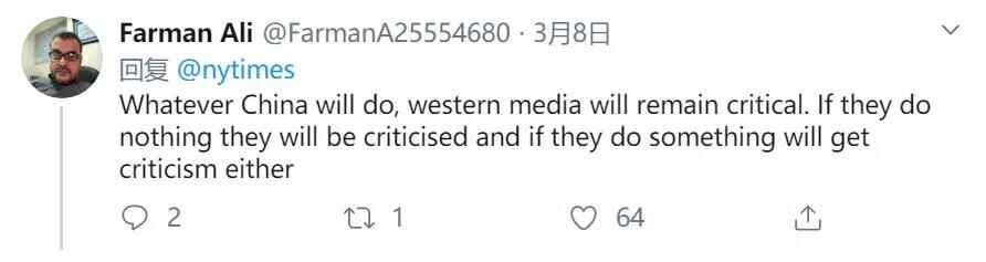 △网友 Farman Ali:无论中国做什么,西方媒体都会进行批驳。如果中国什么都不做,会被批,如果做了什么,依然会被批。