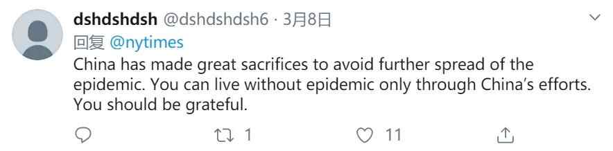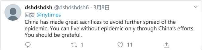 △网友 dshdshash:中国作出了巨大的牺牲以防止疫情扩散,你能活着,没感染疫情,就是因为中国的努力,你应该感恩。