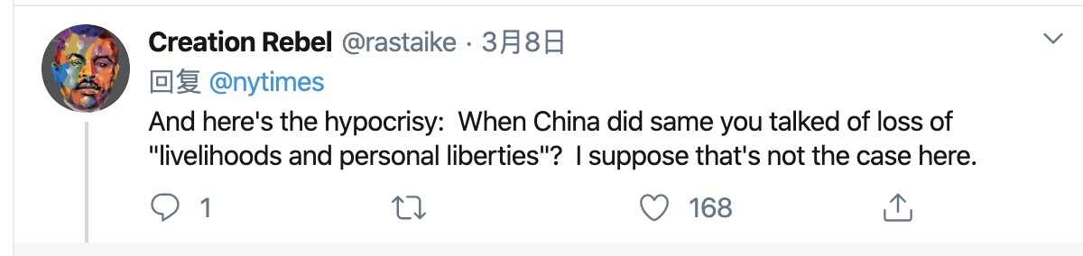△网友 Creation Rebel:讽刺的是,中国这么做的时候你说人家失去生活和自由?我想关键问题不是这个吧?