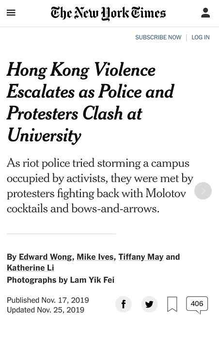 △ 《纽约时报》关于香港暴力升级的报道截图