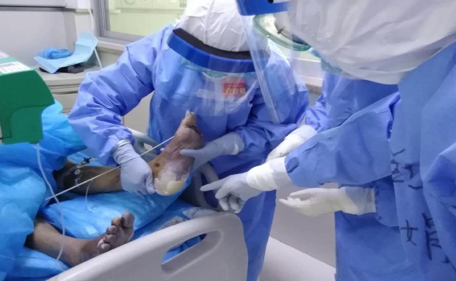 然后,再去1楼的重症一区,这里收治的是危重症患者,病情相对较重,大多数患者需要无创辅助通气或者高流量给氧的治疗。医生们下来查房的时候,我们就跟着医生们一起查房,这样可以更详细的了解患者病情变化及治疗方案,落实医护一体化。病区有两位患者有压力性损伤,这是新冠肺炎疫情下重症患者容易发生的并发症之一,当班的护士是我们医院的创口治疗师许毅敏,我们一起对患者的压力性损伤进行评估和处理并制定详细的护理措施。