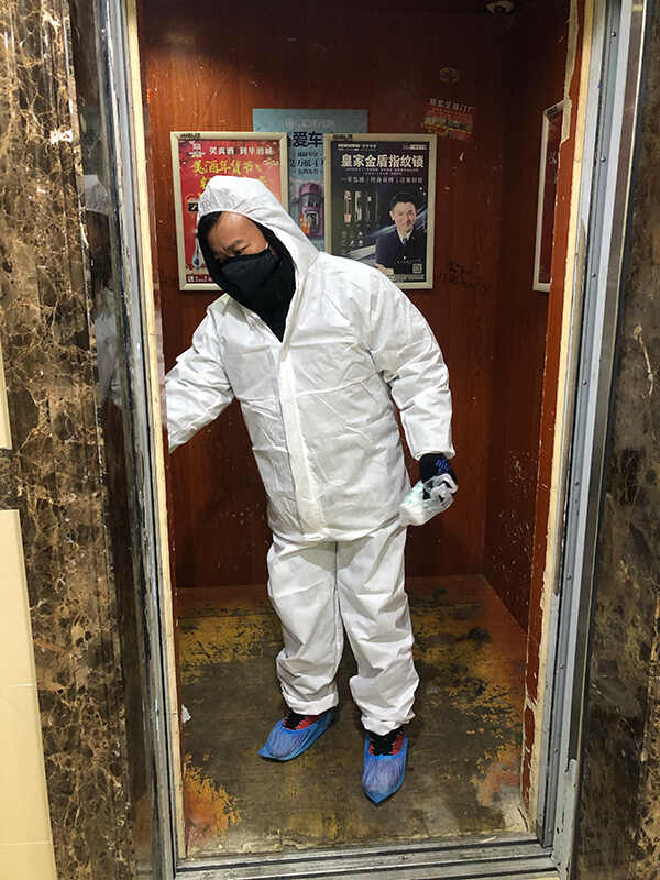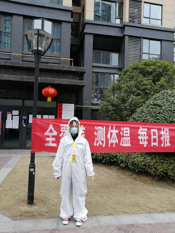 图文:付洪荣女儿范雨禾在楼栋前值守