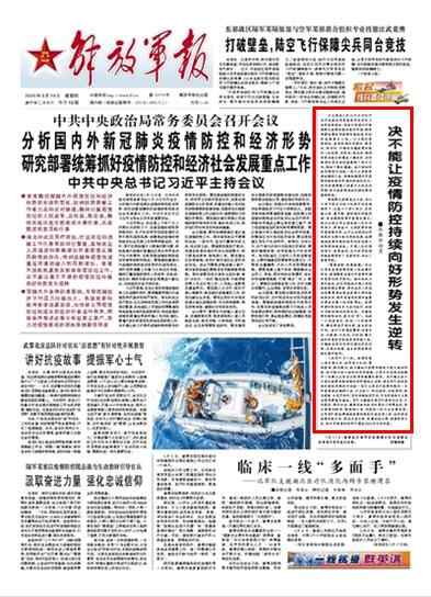 人民军队为人民。疫情防控工作开展以后,我军闻令而动、勇挑重担、敢打硬仗,把支援地方疫情防控作为重大政治任务、作为践行初心使命的实际检验,以有力行动担当起维护人民群众生命安全和身体健康的重任。决不能让来之不易的疫情防控持续向好形势发生逆转,要求军队各级党组织要把思想和行动统一到习主席关于疫情防控的一系列重要讲话精神上来,不忘初心、牢记使命,扛起责任、经受考验,以更严作风、更实举措把党中央、中央军委和习主席决策部署落实落地。军队支援湖北医疗队要牢记宗旨、不怕疲劳,慎终如始,继续在救死扶伤的岗位上拼搏奋战,努力提高治愈率、降低病亡率,向党和人民交出合格答卷。全军部队要统筹推进疫情防控和年度各项工作,切实做到疫情防控不松、备战力度不减、军事训练不停、管理秩序不乱,努力实现国防和军队建设2020年目标任务。