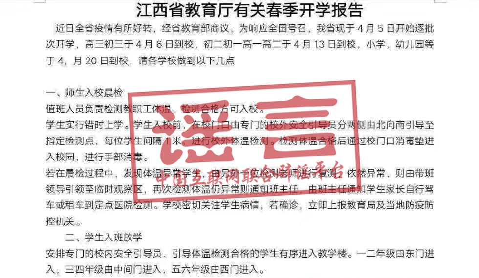 谣言:一则“江西省教育厅有关春季开学报告”在微信朋友圈流传,“报告”指出江西省将于4月5日开始逐批次开学。