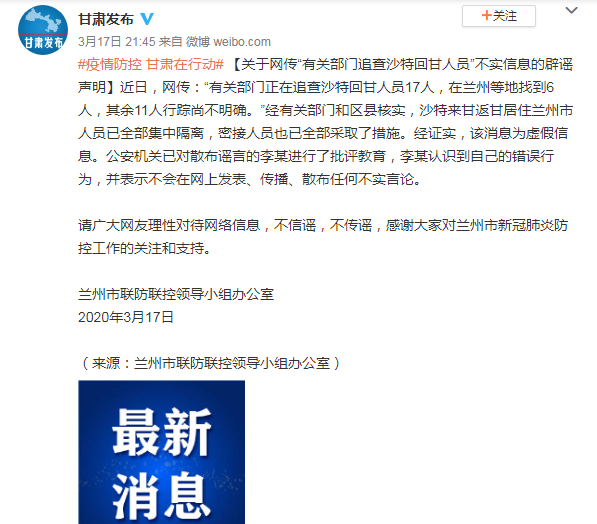 谣言:近日,有网传消息称,“有关部门正在追查沙特回甘人员17人,在兰州等地找到6人,其余11人行踪尚不明确”。