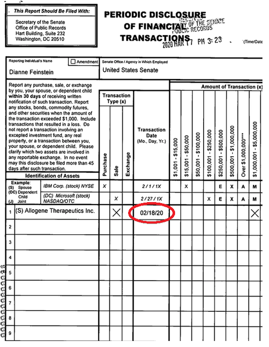 黛安娜·范斯坦和她的丈夫在1月31日起疯狂抛售股票,其中仅在2月18日一天的交易中就卖出了100万至500万美元的股票。交易单清晰地显示,这是一家加利福尼亚生物技术公司Allogene Therapeutics的股票。
