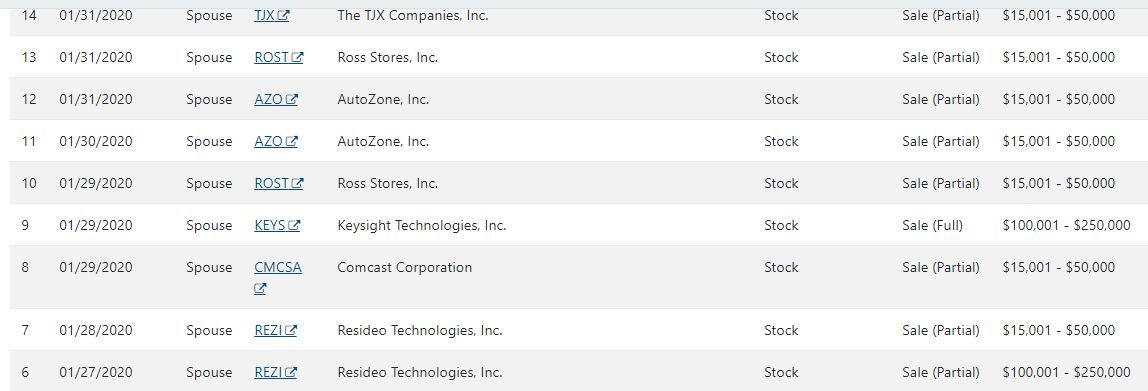 凯利·洛弗勒,她的丈夫杰弗里·斯普雷彻也是纽约证券交易所的董事长,从1月24日开始售出27只股票,价值数百万美元。那天,凯利·洛弗勒在推特上说她参加了参议院关于冠状病毒的介绍会。这对夫妇出售的股票属于埃克森美孚、罗斯百货和汽车地带。
