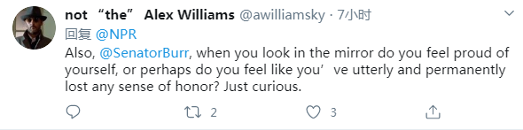 网友:“参议员伯尔,你照镜子的时候是不是感觉为自己自豪,或者也许你感到自己完全地、永远地丧失了荣誉感?只是好奇。”